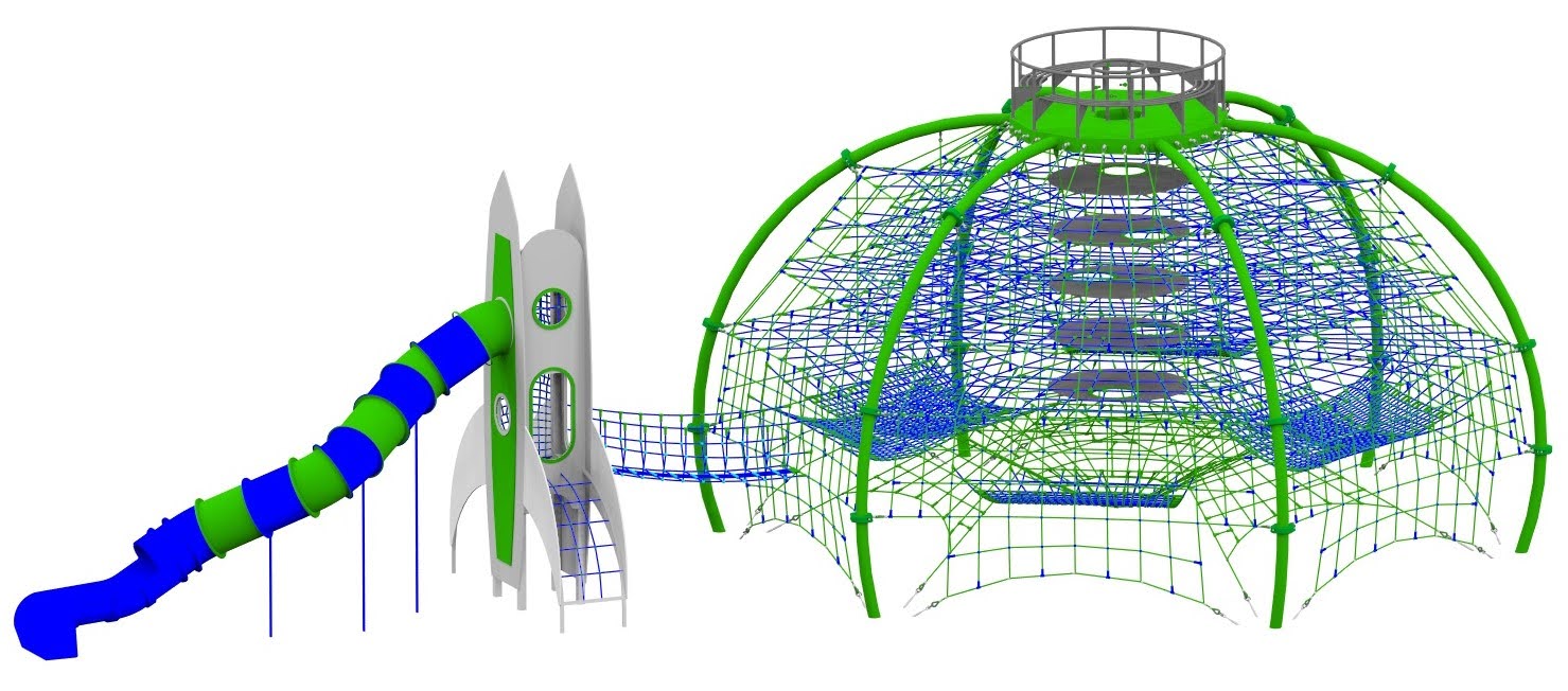 - konstrukcji z płyt HPL oraz stali w kształcie rakiety o wysokości 6,3m z elementami linowymi po których można się wspinać;